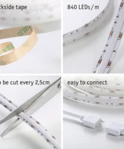 De SimpLED Full-Line COB complete set RGB bevat naast de strip met een lengte van 1,5 m een stekker en is dus meteen klaar voor gebruik. De strip is geschikt voor verschillende toepassingen, bijvoorbeeld als sfeerlicht, oriëntatieverlichting of als indirecte ruimteverlichting. Hij maakt indruk met een volledig homogeen lichtbeeld zonder zichtbare lichtpunten. Dankzij de sfeervolle kleurveranderingsfunctie creëert hij een individuele sfeer in huis, waarbij alles mogelijk is: van een constante eenkleurige verlichting tot meerkleurige lichteffecten. De brede uitstraalhoek van 180° verdeelt het licht perfect zonder schaduwvorming. De doorlopende fosforlaag beschermt tegen stof en vocht.