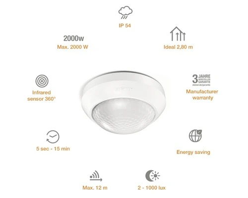 De infrarood-plafondsensor die aan alle eisen voldoet en echt eenvoudig te monteren is. Gewoon geniaal: intelligente technologie die door een slim installatieconcept met slechts enkele handelingen gemonteerd en ingesteld wordt. Dankzij zijn drie pyrosensoren overziet de infrarood-opbouwsensor maar liefst een gebied van 360° en bereikt hierbij een reikwijdte van max. 12 m. Het registratiegebied kan met behulp van afdekplaatjes naar wens worden verkleind. De IS 360-3 is verkrijgbaar in de kleuren zwart en wit.